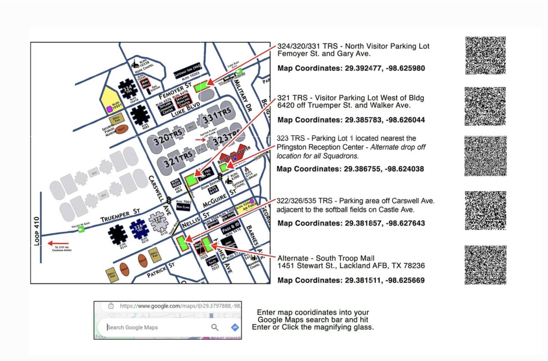 See map below for instructions on where to park should you want to walk directly to each squadron. (326TRS and 535TRS will park at Lot 1 all other Squadrons use the map to find the corresponding lot.) Shuttles will be available at the Pfingston Reception Center beginning at 0830 for transport to the specific squadrons. If you choose to walk there will be MTIs escorting families to the Squadron areas from the PRC. (Map can also be found here.)