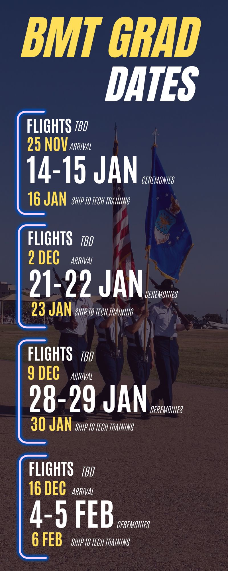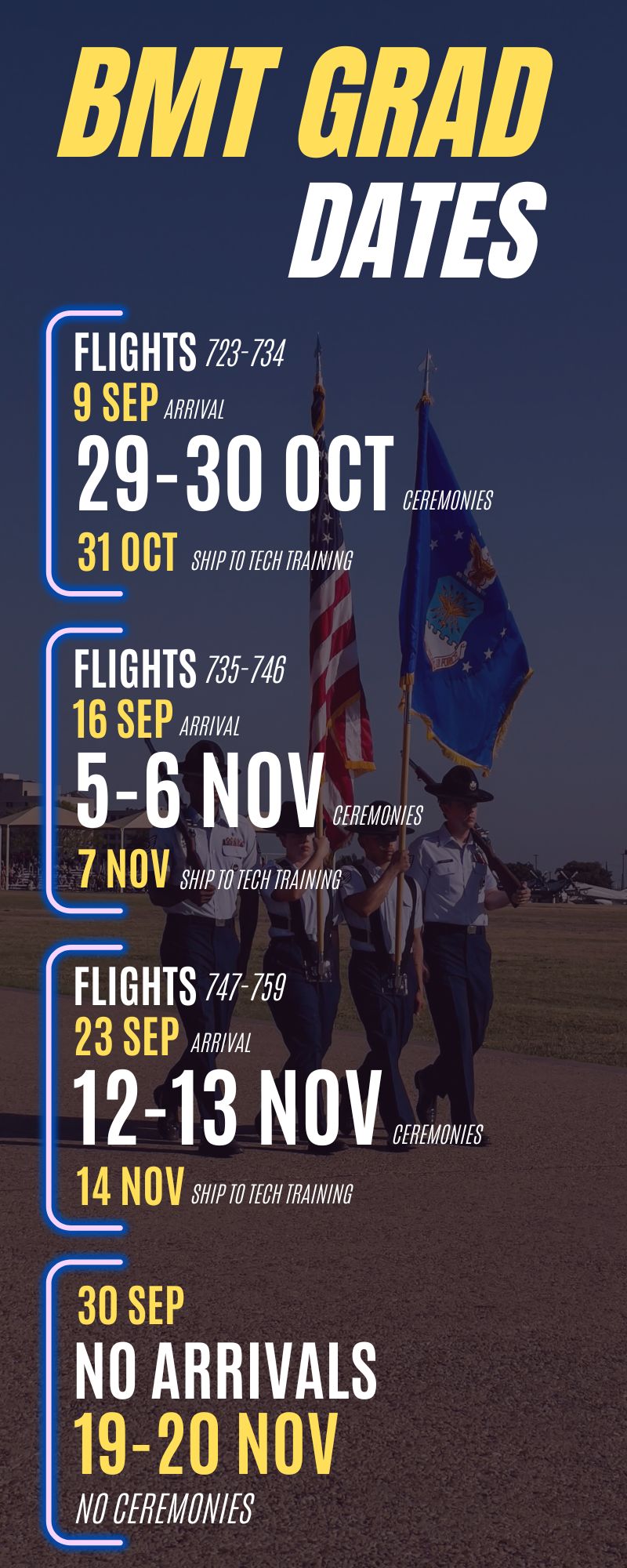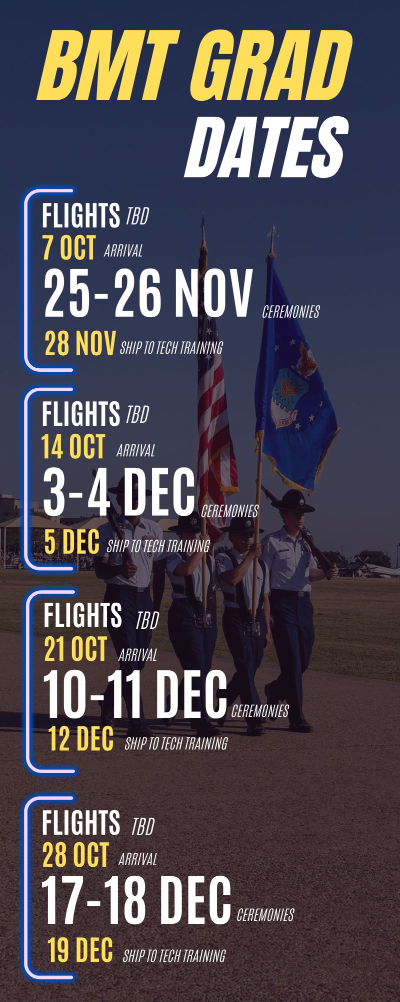 Keep in mind that the dates for your trainee can change if they are recycled due to disciplinary actions and/or not meeting BMT Standards. If you are planning on booking travel early we advise you make sure your tickets/reservations are refundable if in the case your trainee must be recycled. If your trainee is recycled they will have an opportunity to inform their families/friends if it has occurred.