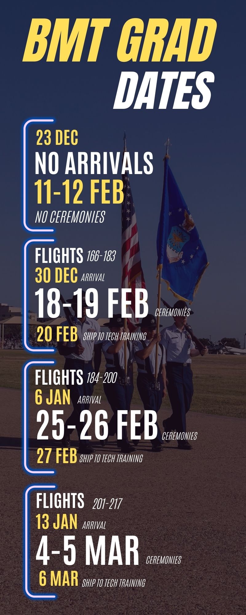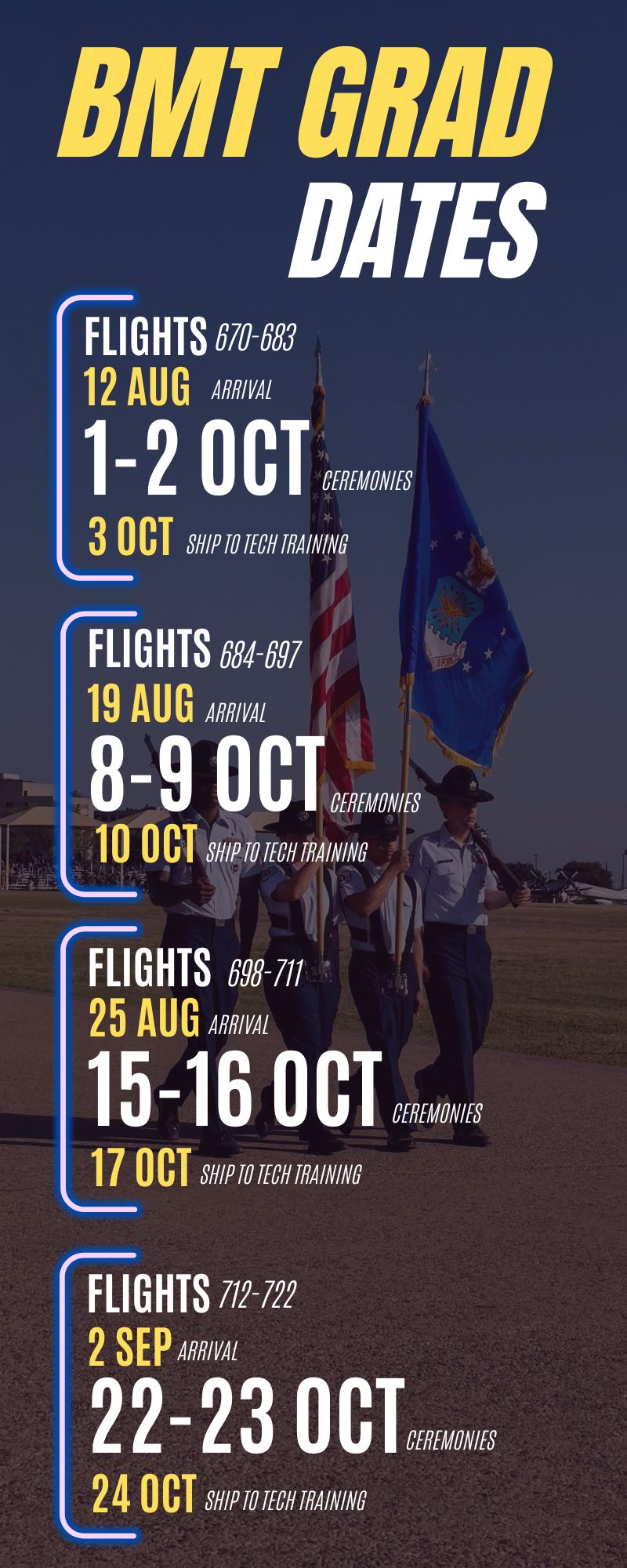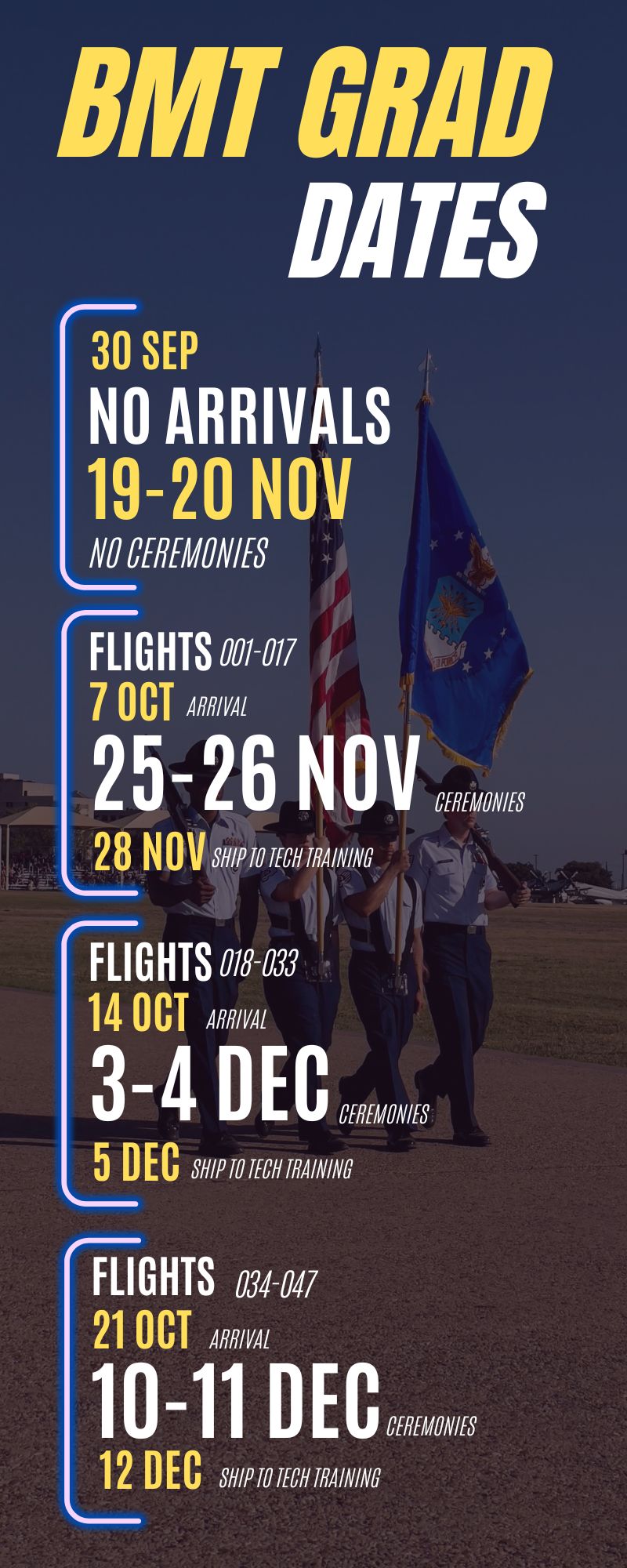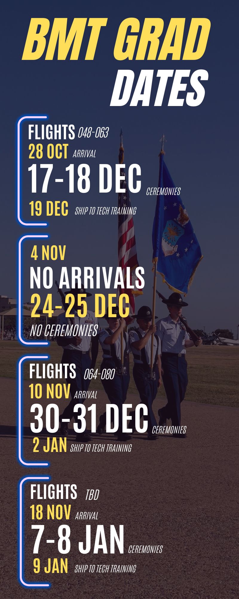 Keep in mind that the dates for your trainee can change if they are recycled due to disciplinary actions and/or not meeting BMT Standards. If you are planning on booking travel early we advise you make sure your tickets/reservations are refundable if in the case your trainee must be recycled. If your trainee is recycled they will have an opportunity to inform their families/friends if it has occurred.